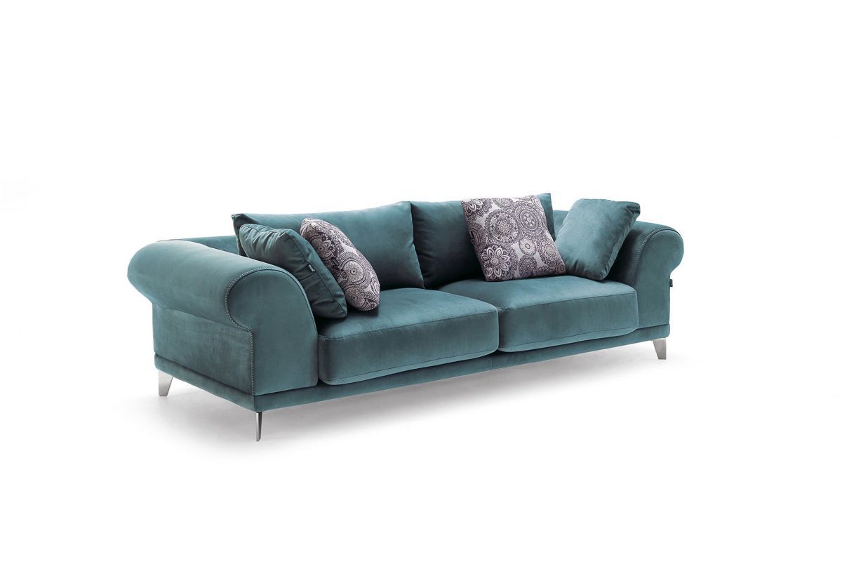 Patas metálicas que atribuyen al conjunto una sutil carga de sensibilidad y estilización. Siendo un volumen bastante compacto y denso, descubrimos anchos y contundentes brazos que se unen por detrás para aroparnos junto a todos los cojines y decorativos que lo habitan. El resultado final nos hace sentir satisfacción y glamour en su totalidad, y una gran comodidad a pesar de su baja altura.