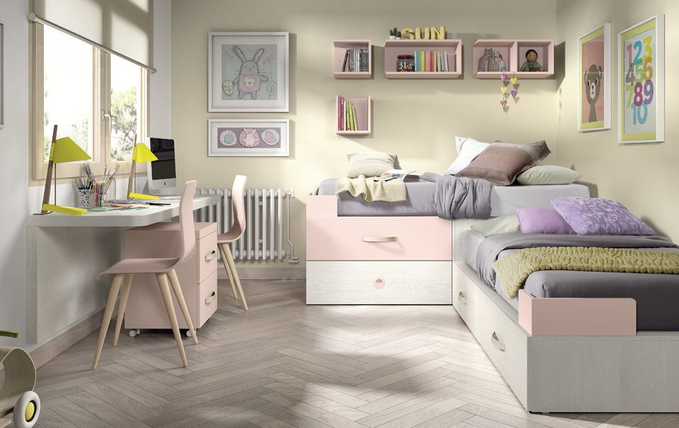 Sistema de módulos Box System, Estanterías y box de diversas medidas, Escritorio colgado y esquinas curvadas y mesita con ruedas. Medidas 306 x 204 cm. Disponible en varias medidas, colores y tiradores.