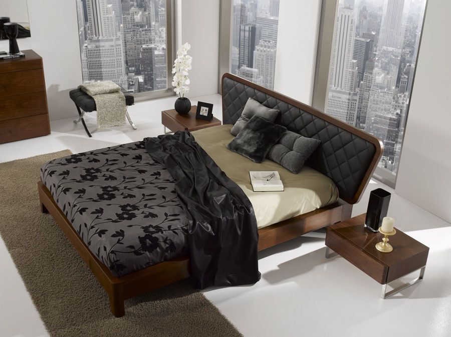 Dormitorio en nogal y tapizado en polipiel negro